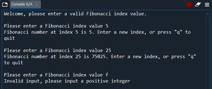 As this was our first real program written in Python, the goal of this lab was to become familiar with recursion, learn how to implement a function, and review simple logic. See Figure 1.1 below for an example of displayed messages from this program, or see Fibonacci.py for the full file documentation.