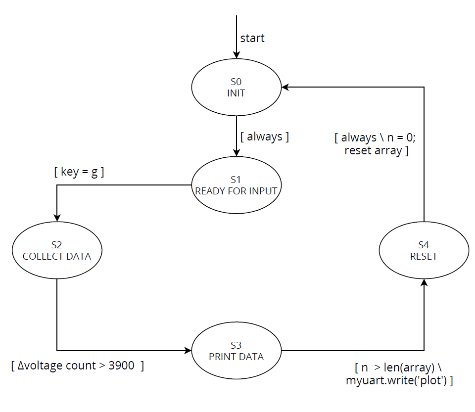 In addition to the plots generated during program operation, a state transition diagram developed for the UI task running on the Nucleo has been included below for refrence.