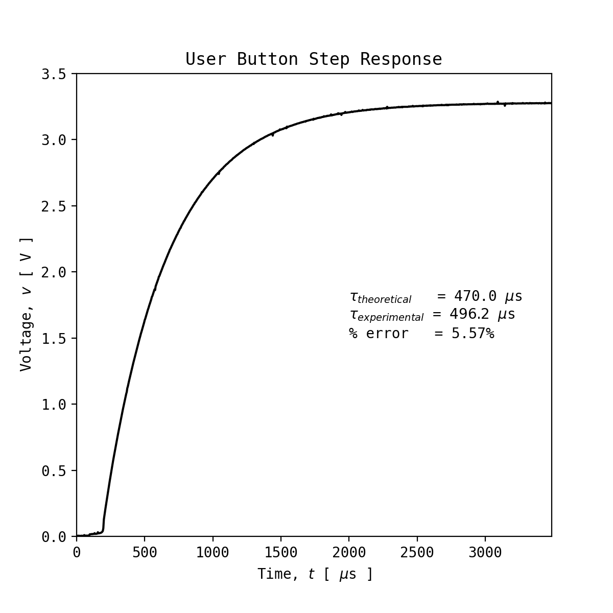 This lab centered around measuring the time constant of the B1 "USER Button" on the Nucleo board. In almost all Mechatronics applications, it is critical to be aware of how certain components react. When the button is pressed, the button circuit is shorted, and the voltage quickly (typically modeled as instantaneously) drops to zero. However, upon release the button is subject to a first-order RC circuit. Thus, in order for us to fully understand how a full system that includes the button will function, we want to measure the time response for the button release phase.