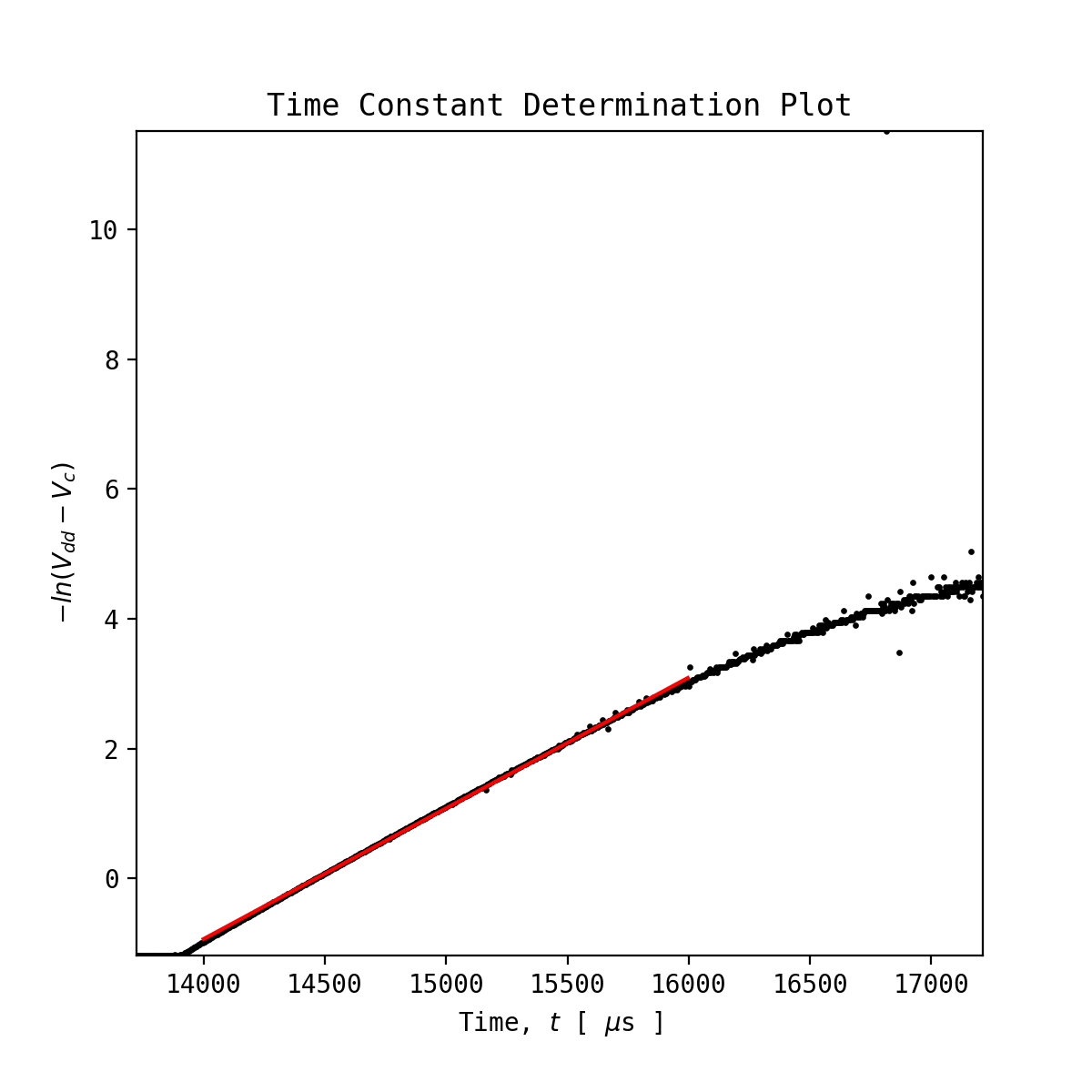 Figure 1 below is a plot of the time response of the voltage within the circuit. This is plotted with -ln(Vdd-Vc) where Vdd is the maximum voltage (3.3V) and Vc is the current voltage of the system.