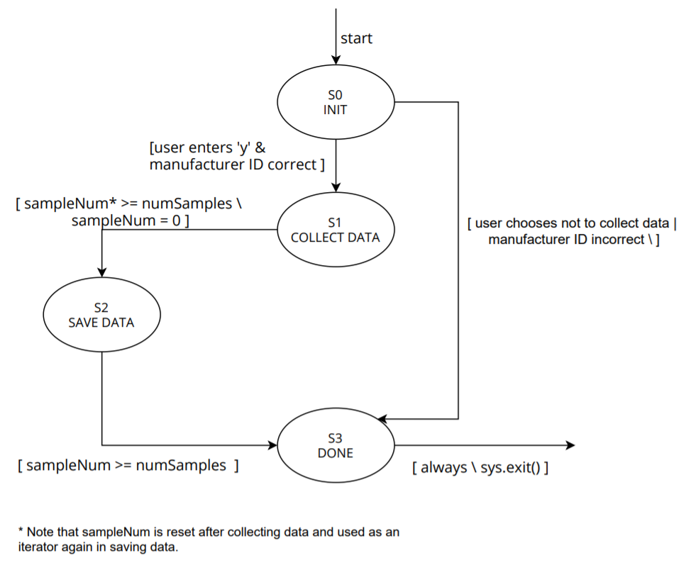 To organize the driver, a simple finite state machine was created in order to smoothly transition between taking and saving data. This can be seen in Figure 4.0.