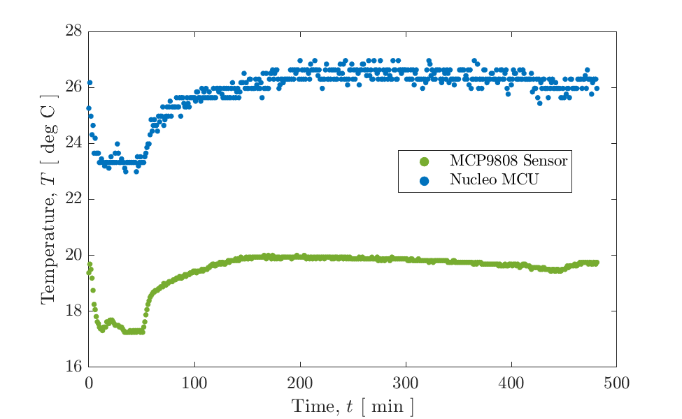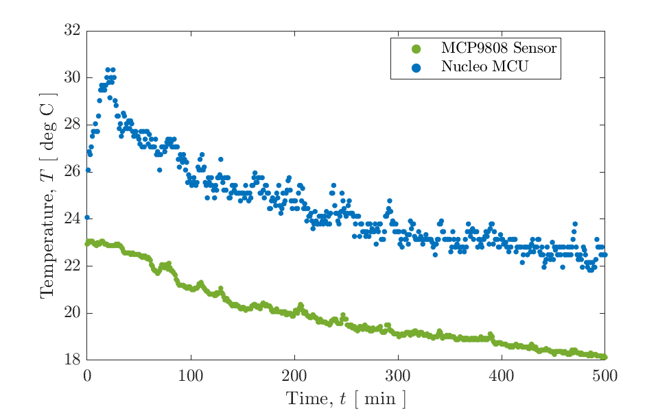From these input values, the script determines what size arrays must be preallocated, and data collection begins. The plots below in Figures 4.1 and 4.2 show the results of two data collection sessions, one from each member of our group. Note that as a general comparision, data was also collected directly from the Nucleo MCU. This comparision gave proof that using the MCU core temperature (for the Nucleo board) is not an accurate measurement of the true ambient temperature. For both plots shown, the sensor data is much less scattered, and significantly lower in magnitude, as it is not affected by the extraneous effects of heat generated by the Nucleo from processing.