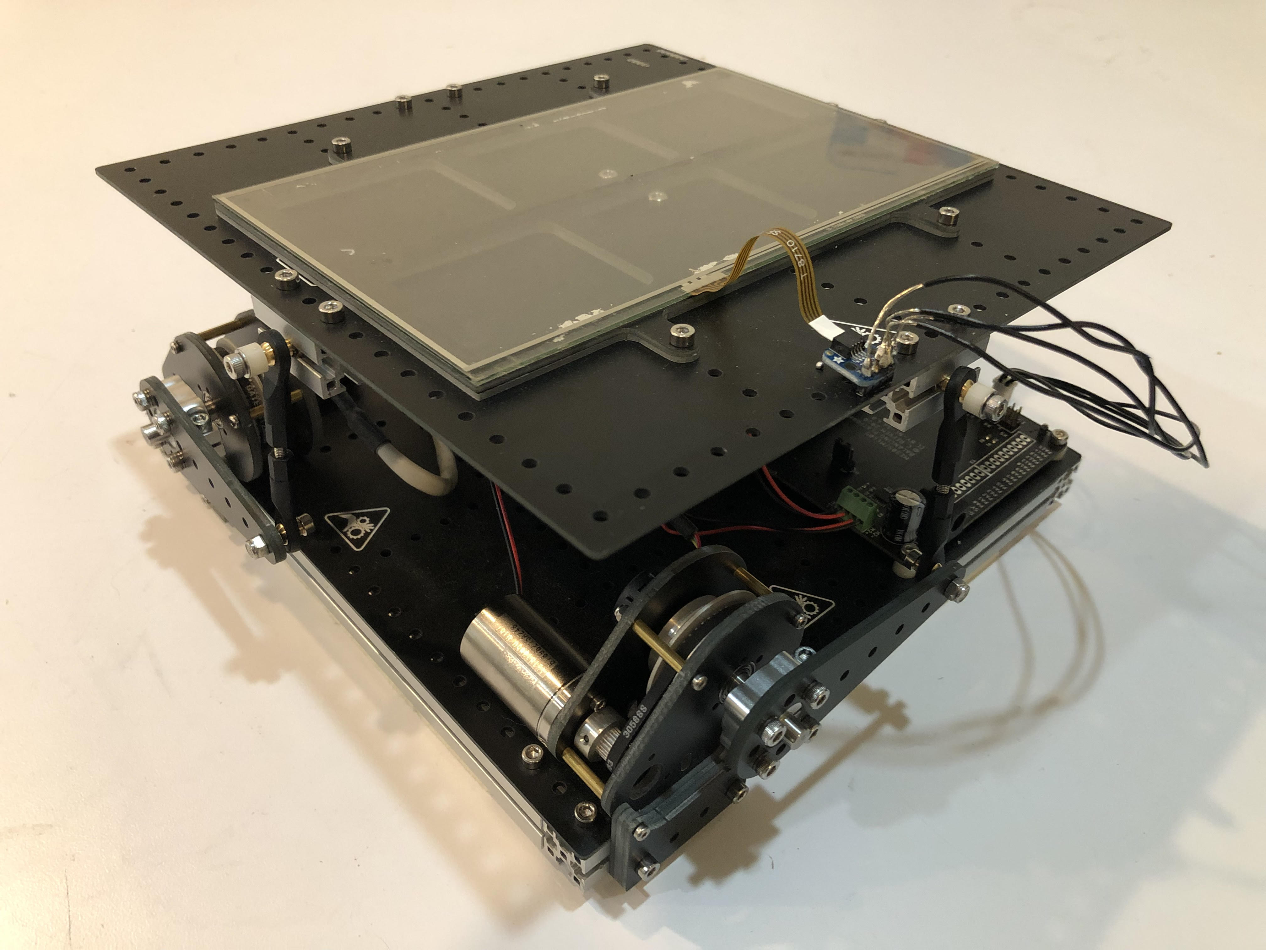 The platform pivots in two planes of motion, and has two connections to two separate motors. These motors control a 4-bar linkage system which controls the tilt angles of the platform. The ball rests on the platform, which has a resistive touch panel for tracking the position of the ball in both X and Y directions.