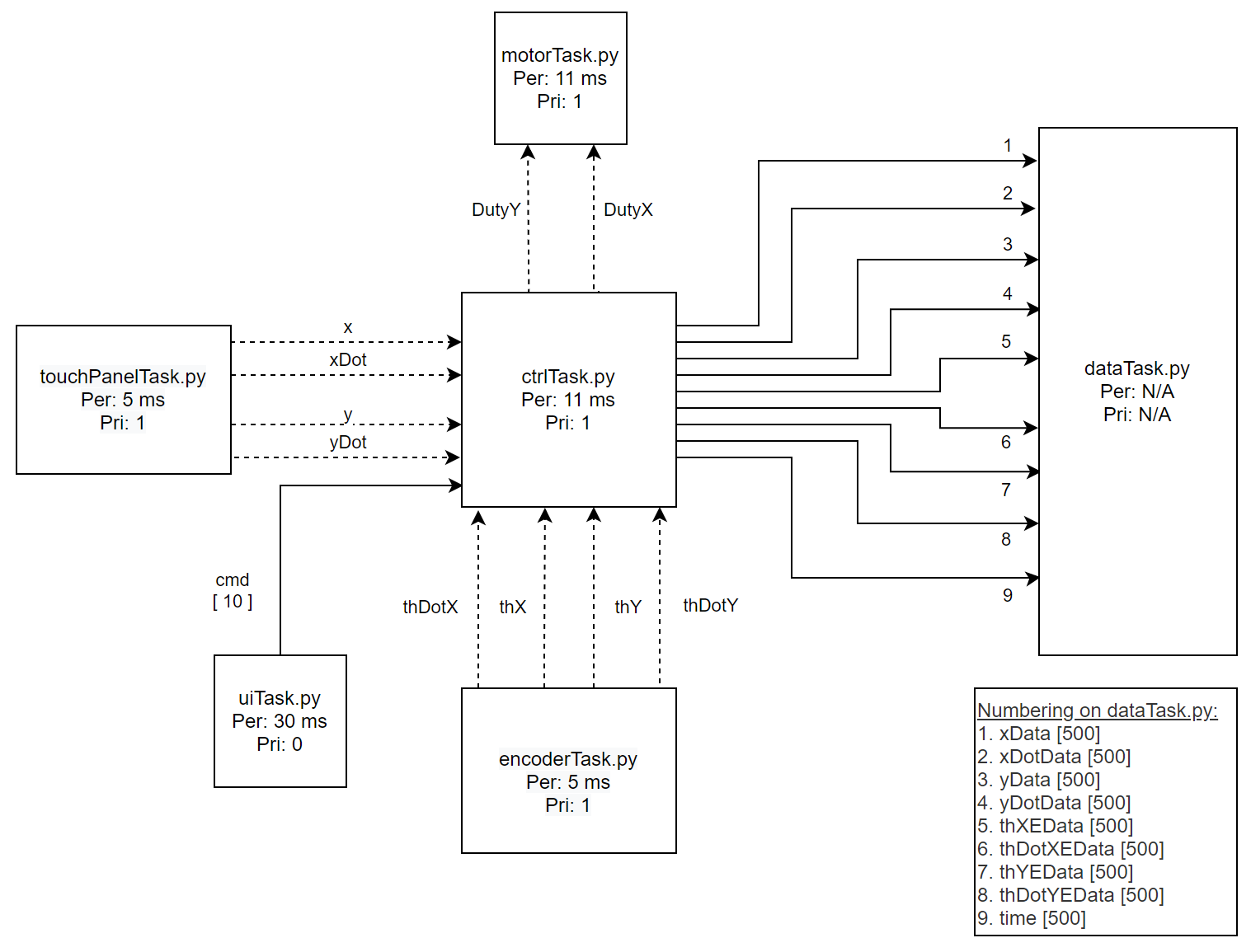 Throughout the program, several variables had to be shared between tasks in order to implement the full-state feedback control algorithm. These included the position/velocity of the ball as well as the platform angle/angular velocity. From these, the duty cycle was computed and shared to the motor task to drive the motors.